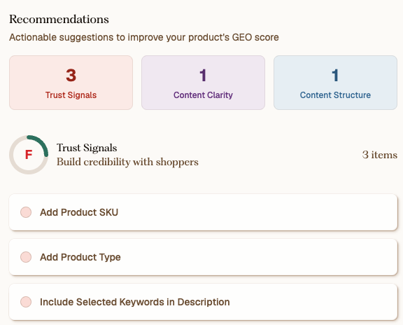 Every product you generate content for gets a GEO Score, graded from A–F. This score gives you a snapshot of how likely your content is to be surfaced or cited by AI search engines.