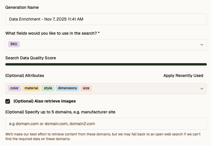 - Use the domain filter if you only want enrichment from a specific source (like a supplier or brand website).